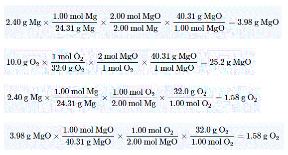 For example: Calculate the mass of magnesium oxide possible if 2.40 g Mg reacts with 10.0 g O2