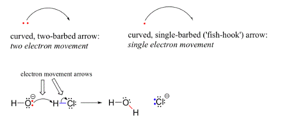 When considering chemical reactivity, the best description is the transfer of an atom or electrons which represents the forming or breaking of a bond. For example, in an acid and base reaction, the acid transfers a proton to a base or another way of saying this is that the lone pair of electrons on the base takes the proton. A key to understanding a reaction mechanism is electronegativity and electron movement. The base is more electronegative and the acid has low electron density by comparison. The hydroxide ion due to the electronegative oxygen atom in the hydroxide ion has high electron density. The hydrogen atom in HCl, on the other hand, has low electron density: it is electron-poor. There is an attraction between electron rich and electron poor. As hydroxide and HCl approach each other, a lone pair of electrons on the electron-rich hydroxide oxygen is attracted by the electron-poor proton of HCl, and electron movement occurs towards the proton. The two electrons in the hydrogen-chlorine bond are repelled by this approaching hydroxide electron density, moving even farther away from the proton and towards the chlorine nucleus. The consequence of the electron movement is that the hydrogen-chlorine bond is broken, as the two electrons from that bond completely break free from the hydrogen and become a lone pair in the chloride anion. Curved arrows represent electron movement when drawing two or more resonance contributors for a single molecule or ion. These same curved arrows are used to show the very real electron movement that occurs in chemical reactions, where bonds are broken and new bonds are formed. The HCl + OH– reaction, for example, is depicted by drawing two curved arrows. The first arrow originates at one of the lone pairs on the hydroxide oxygen and points to the ‘H’ symbol in the hydrogen bromide molecule, illustrating the ‘attack’ of the oxygen lone pair and subsequent formation of the new hydrogen-oxygen bond. The second curved arrow originates at the hydrogen-bromine bond and points to the ‘Br’ symbol, indicating that this bond is breaking – the two electrons are ‘leaving’ and becoming a lone pair on bromide ion. It is very important to emphasize at this point that these curved, two-barbed arrows always represent the movement of two electrons.