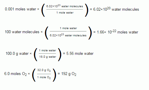 Once the balanced equation is correct, it is possible to calculate the amount (as a solid, liquid or gas) depending on the type of reactant or product in a variety of units. For mass, the most common units are kilograms (kg), grams (g), milligrams (mg). For liquids, the most common units are liters (L) or milliLiters (mL). For gases, the units vary from pascals (Pa) to atmospheres (atms) to millimeters mercury (mmHg) to Torr. To complete the calculations for stoichiometry, it is important to convert the amount in grams or Liters or Pascals into moles. A mole of a substance is defined as: The mass of substance containing the same number of fundamental units as there are atoms in exactly 12.000 g of 12C. The number of grams in a mole is different from substance to substance. A dozen cats have a different weight than a dozen dogs- but in each case, you have a dozen animals. Likewise, a mole of oxygen gas has a different weight than a mole of water- but in each case, you have 6.02×1023molecules. A mole of any substance is 6.02×1023 molecules of that substance. Use this as a conversion factor to turn moles into molecules.